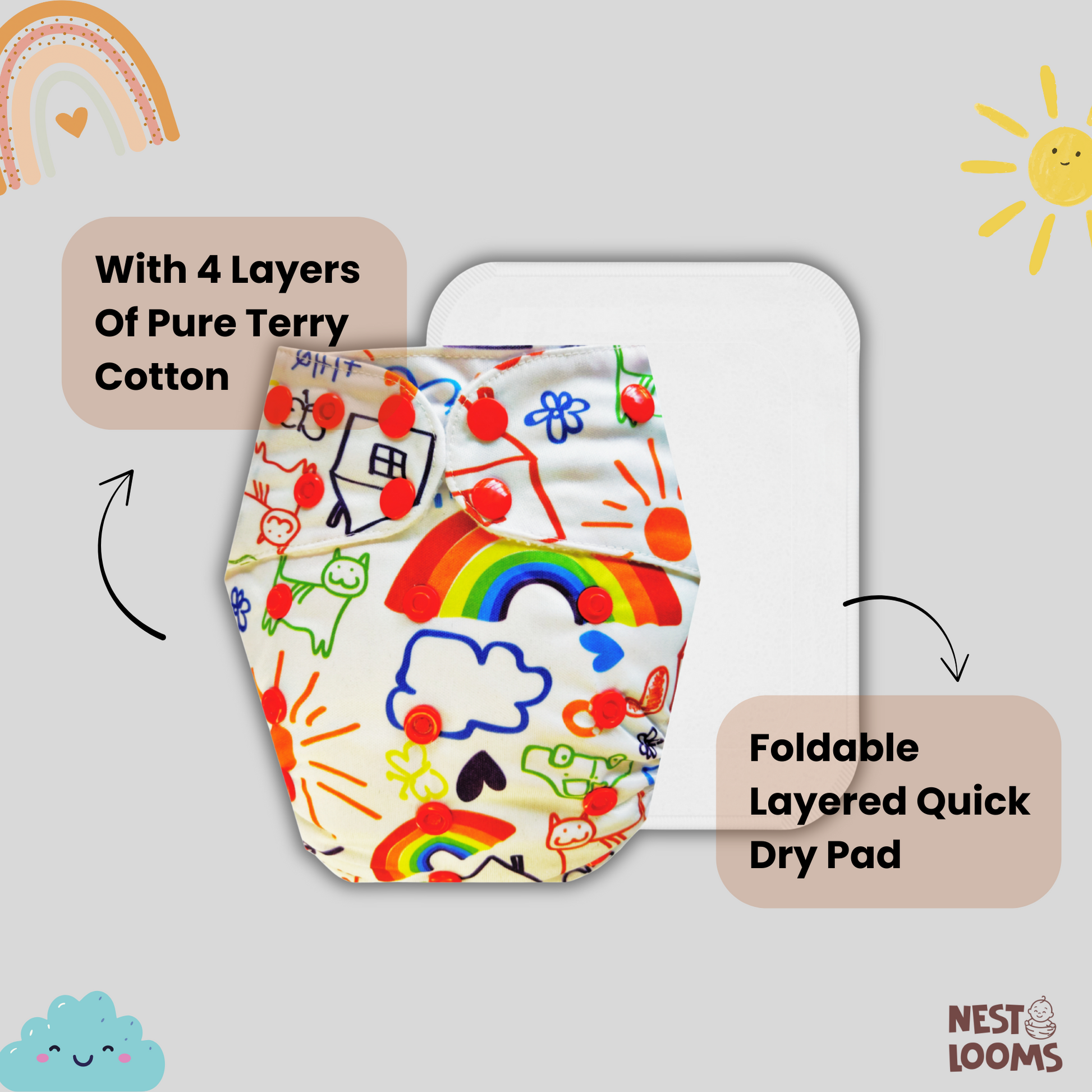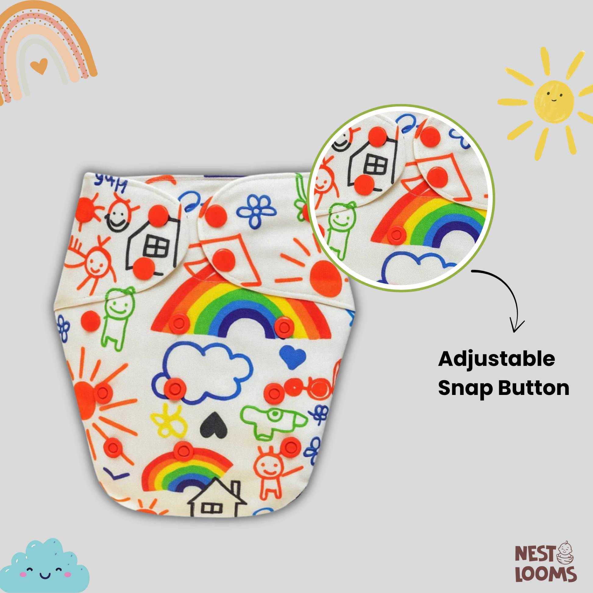 Keep your baby comfortable and the planet happy with our reusable cloth diapers. Made from premium, breathable fabric, these diapers are gentle on delicate skin and help prevent rashes. The adjustable snap buttons ensure a snug fit as your baby grows, while the inner absorbent layer keeps them dry for longer. Available in cute, colorful prints to make diaper time more fun.